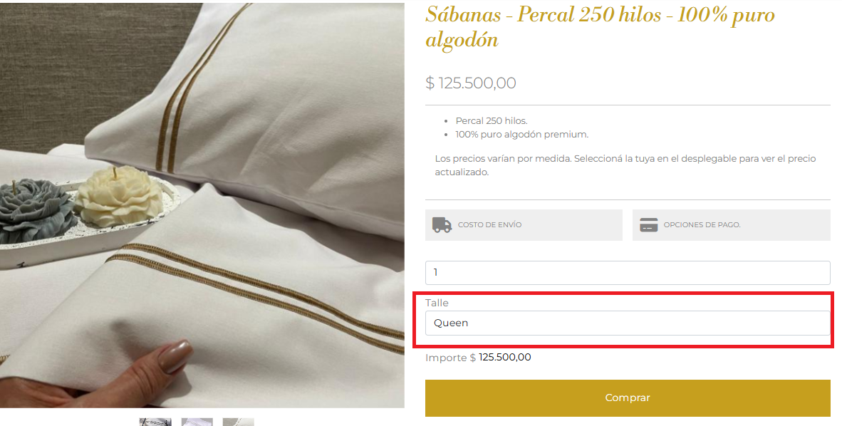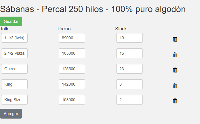 Por ejemplo, esta Sábana de 250 hilos, tiene 5 talles : Twin, 2 plazas y media, Queen, King y King Size. Cada una tiene un Precio y un Stock diferente.