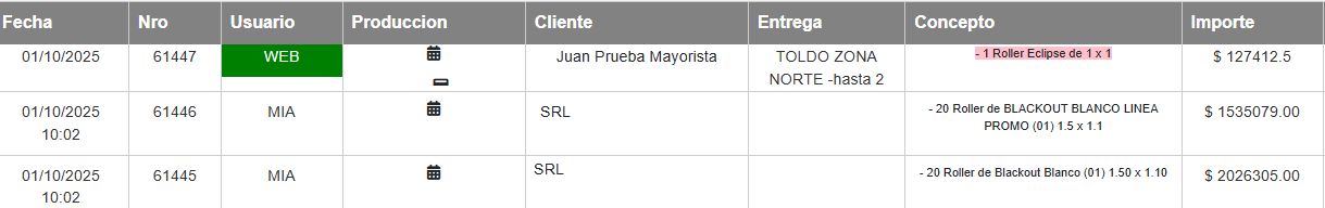 Por ejemplo, en esta lista se muestran 3 Presupuestos, el primero cargado desde la TIENDA WEB por el cliente Juan Prueba, y los otros dos cargados desde el Puesto de Ventas del usuario MIA para el cliente SRL.